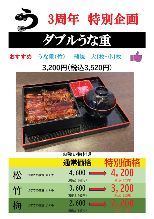日頃のご愛顧に感謝を込めて、当店自慢の「ダブルうな重」を特別価格にてご用意いたしました。